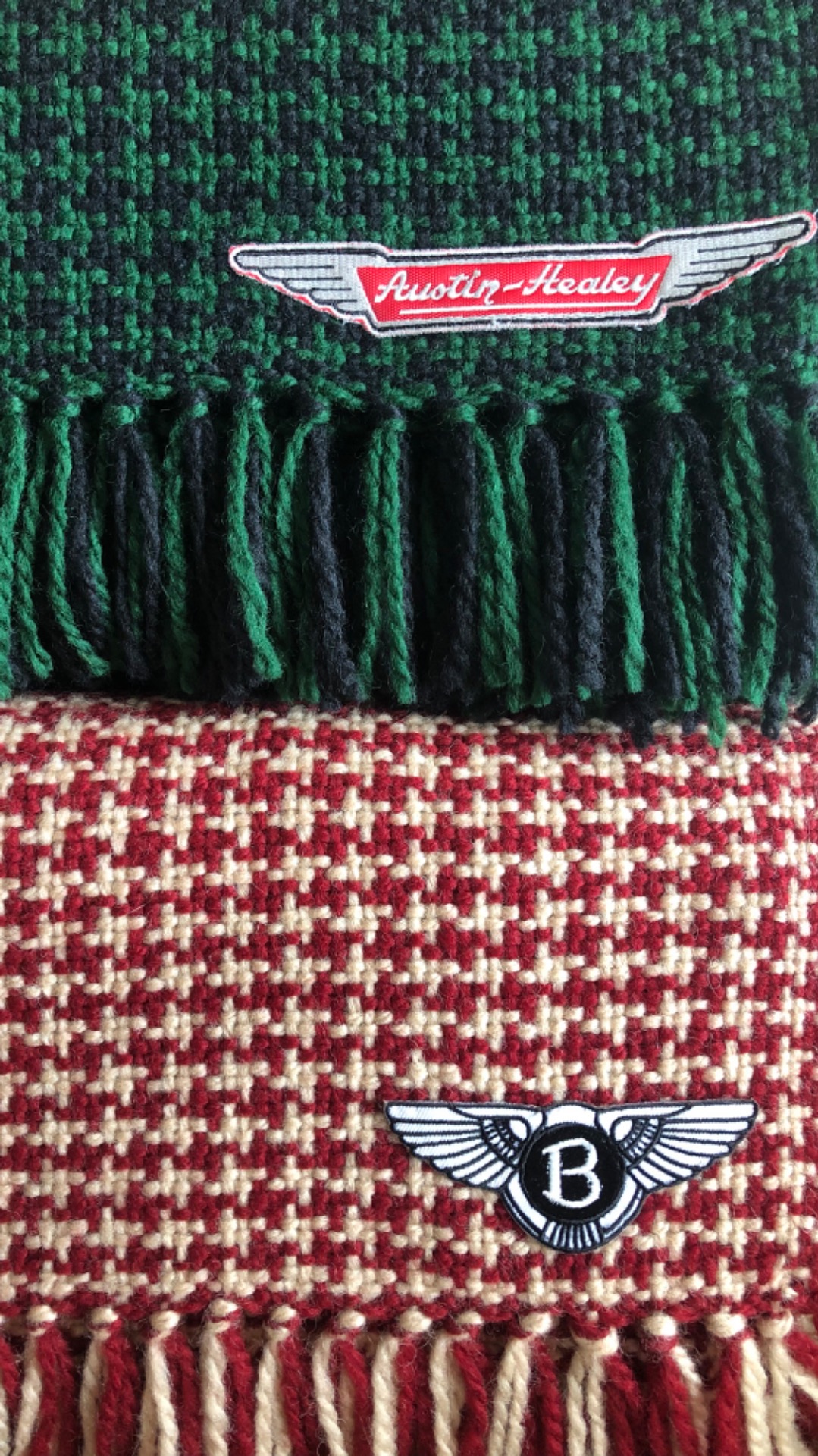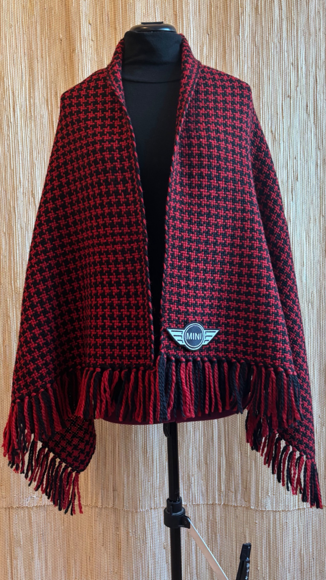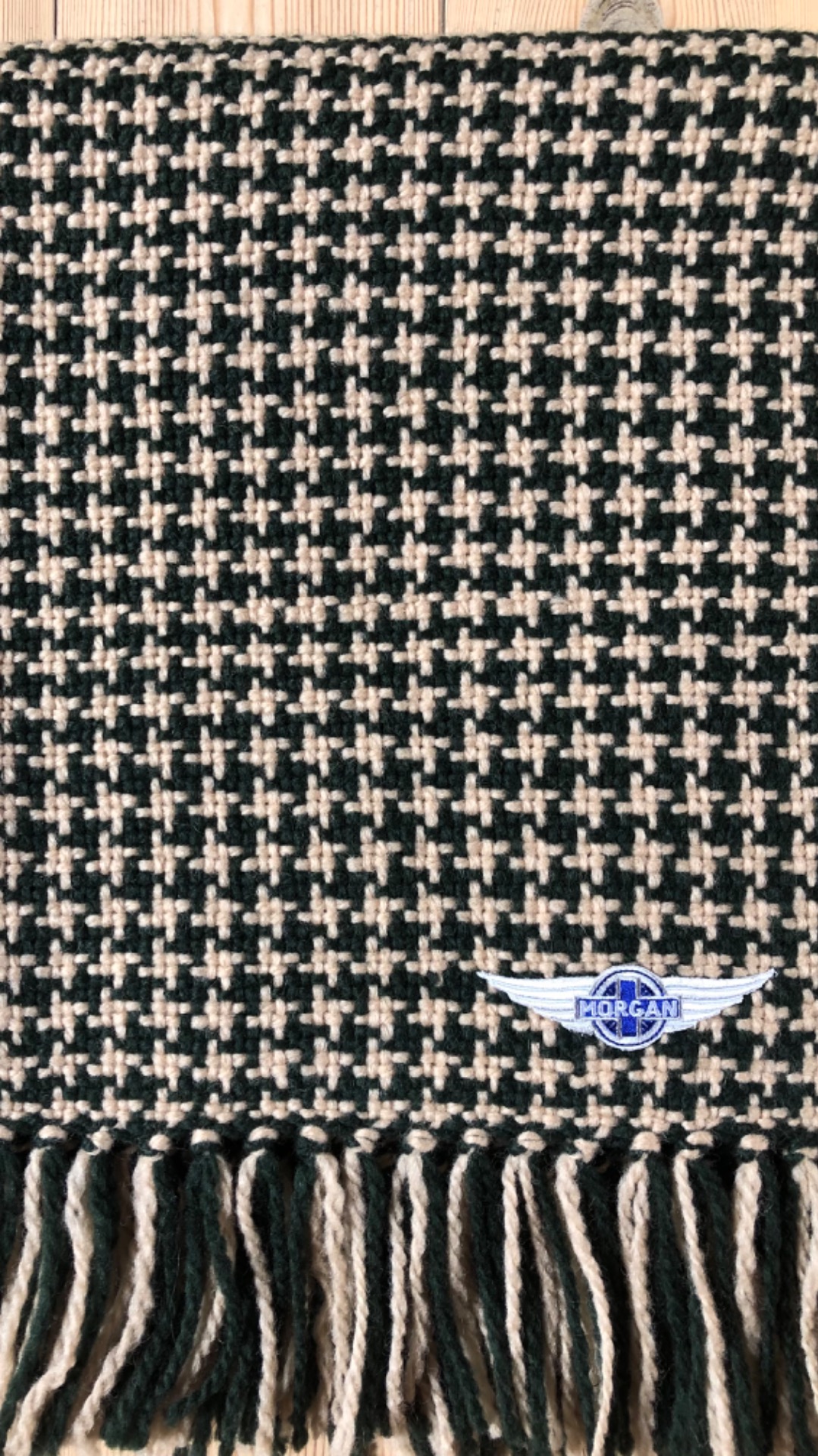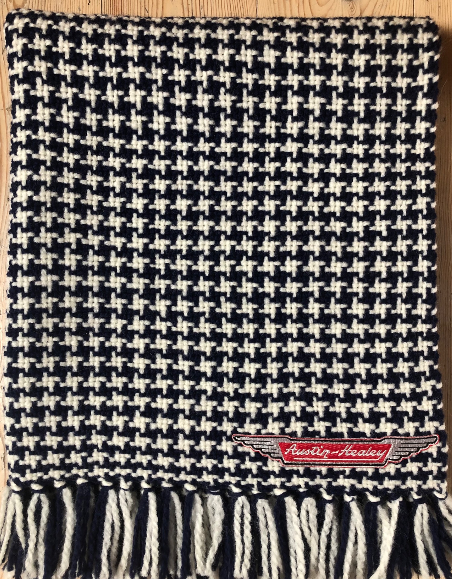 Pleddet veves i det gamle britiske mønteret houndtooth og kan bestilles i bilens farger.