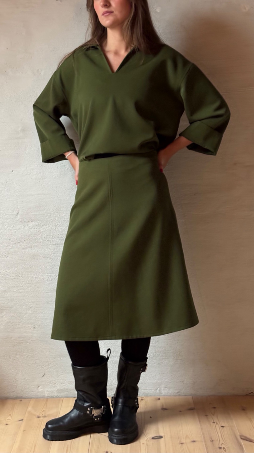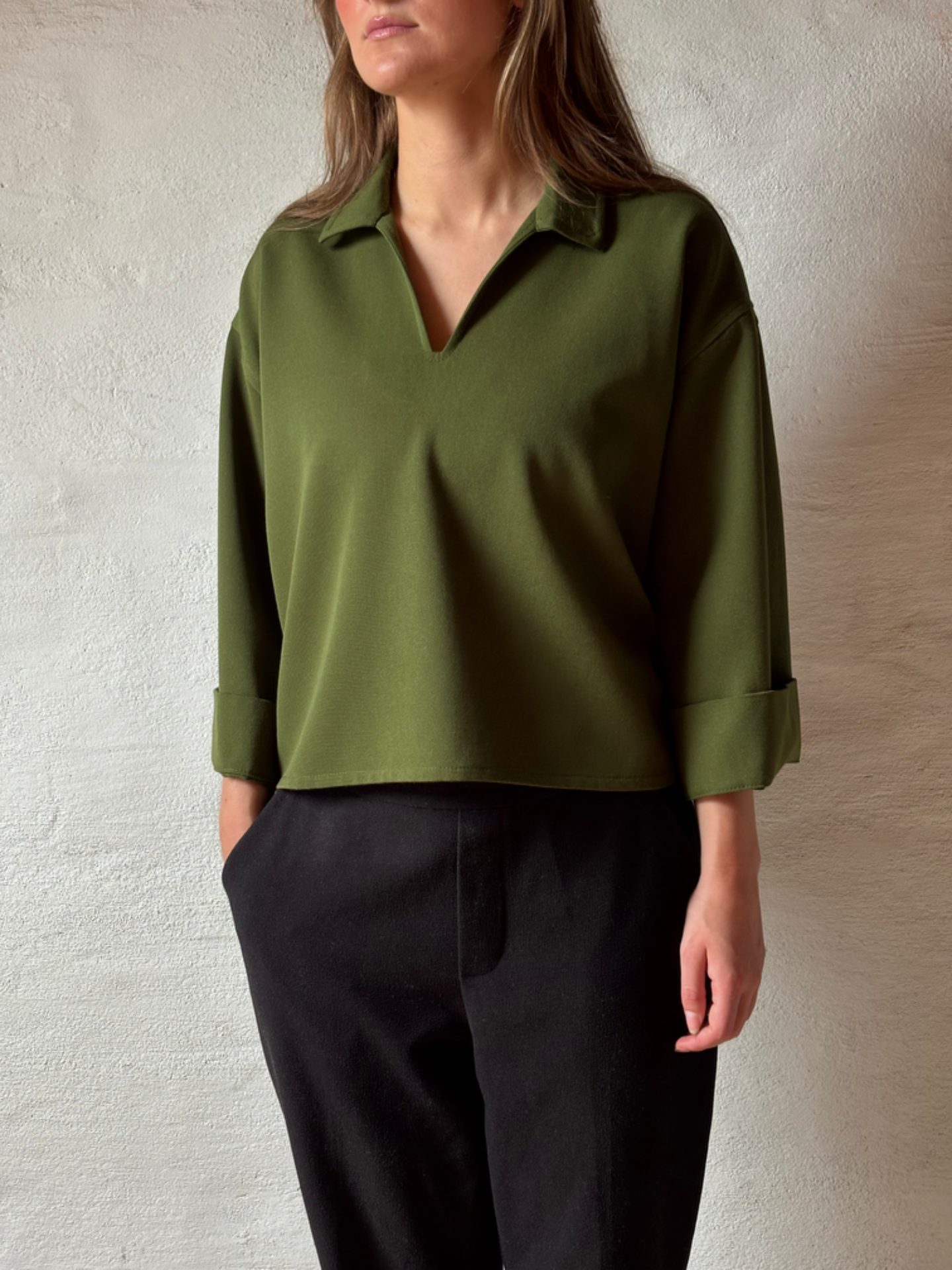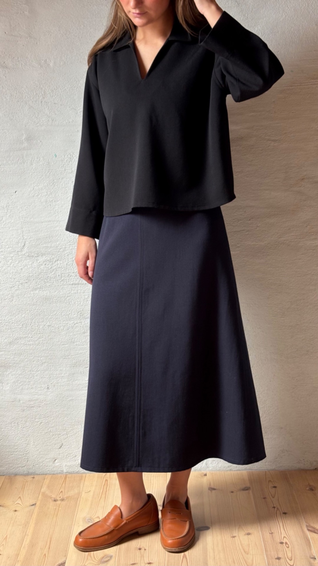 Skjorte med behagelig vidde, krage og splitt foran i norskprodusert ulldrapé fra Gudbrandsdalen Uldvarefabrik.