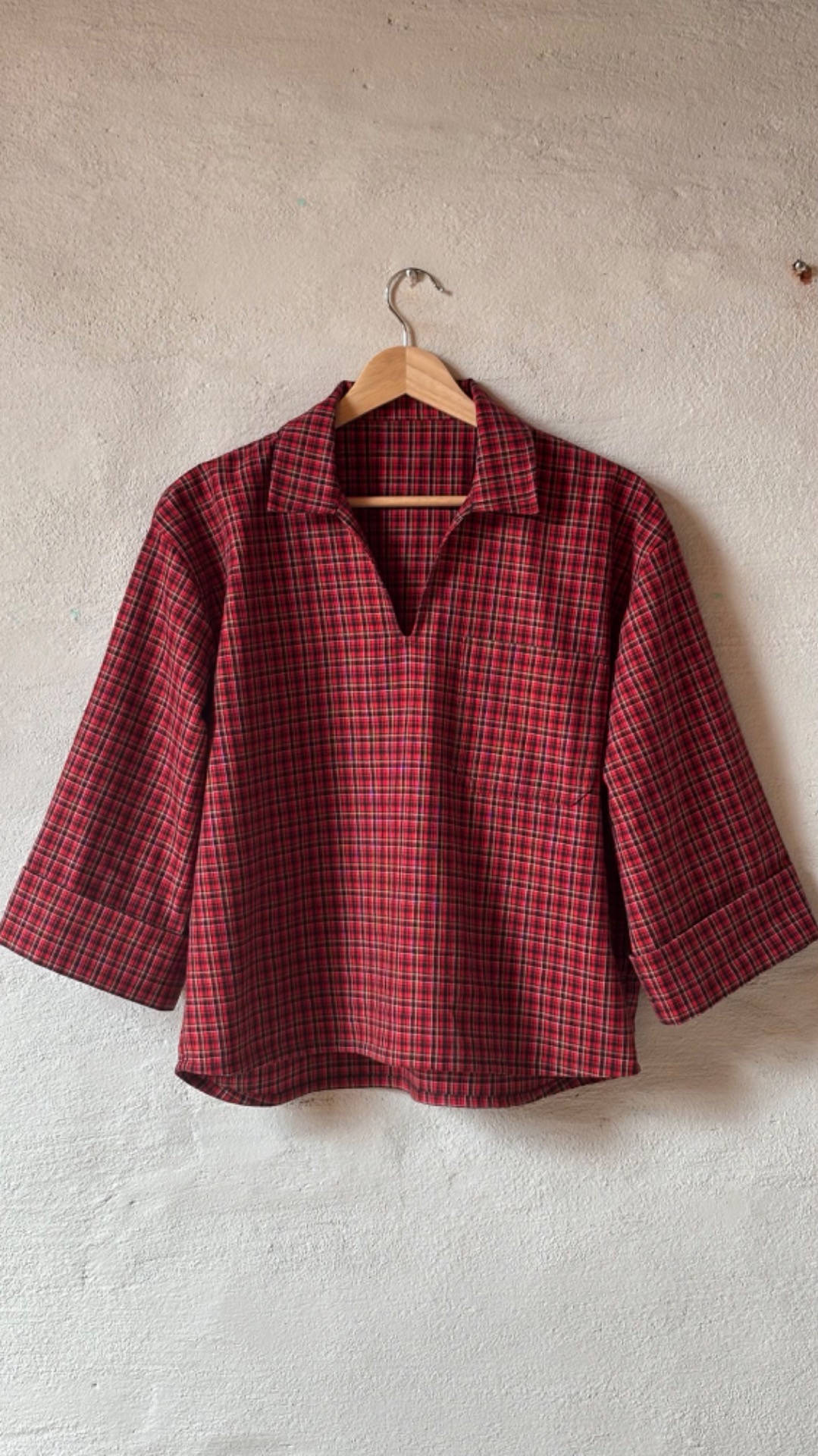 Skjorte i tradisjonsrikt bomullsstoff fra Solberg Spinderi. Skjorten har splitt foran, krage og vide ermer med brede mansjetter som er fine å brette opp. Skjorten kan bestilles med eller uten lommer og i flere mønstre.